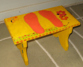 Pintei e fiz decoupage neste banquinho pra baixinha subir na hora de escovar os dentinhos...desenhei o contorno do pezinho e pintei de laranja, fiz isto pra podermos acompanhar o crescimento dele (do pé)...ela adorou...não preciso dizer que mede várias vezes por dia, rsrsrs